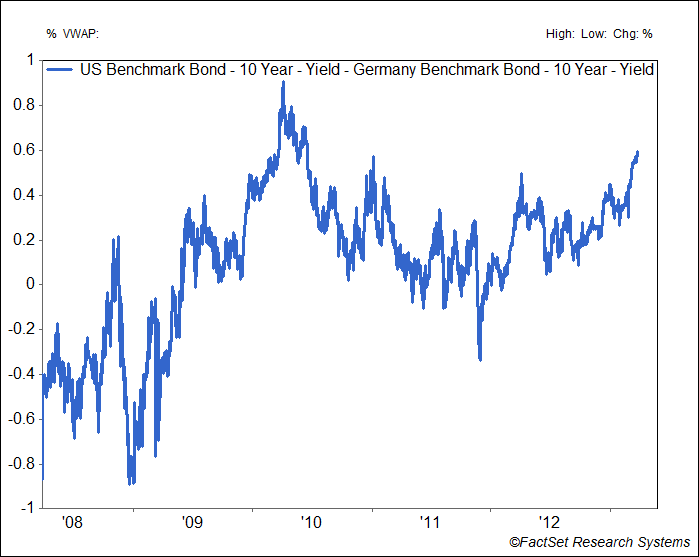 По данным Дэвида Кибли из Credit Agricole Corporate and Investment Bank, спрэд между доходностью американских ценных бумаг и бундов используется инвесторами, которые переключаются между европейскими и американскими долгами. Казначейские ценные бумаги исторически были более волатильны в сравнении с немецкими бундами, считает он. Доходность американских бумаг уходит от бундов, которые пострадали за последние недели из-за возрождения долгового кризиса в Европе. Доходность американских десятилеток во вторник составила 1.91%, что на 56 пунктов больше, чем текущая доходность немецких десятилеток в 1.35%. Доходность двигается обратно ценам, и один пункт – это 1/100 процентного пункта. Спрэд был отрицательным большую часть времени с 2008 года, пика американского финансового кризиса.
