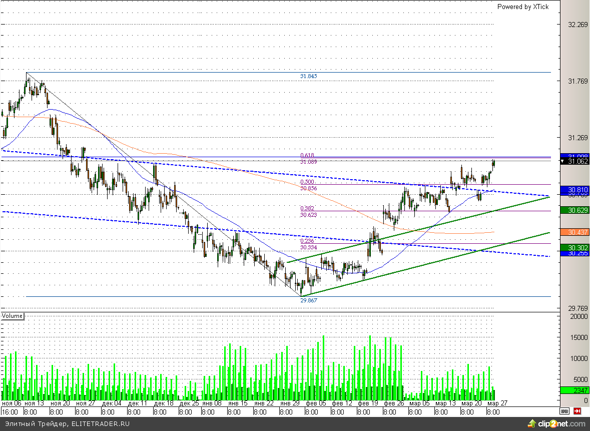 Рубль к доллару прибавляет 3 копейки. При этом сегодня завершается налоговый период в России, и данный фактор стимулирует повышенный спрос на национальную валюту, оказывая ей существенную поддержку. Достижение нефтью сорта Brent 110 долларов за баррель также позитивно для рубля. Впрочем, учитывая, что налоговый период уже завтра не будет создавать дополнительный спрос на рубли, а отметка 110 для нефти является существенным сопротивлением, то в краткосрочной перспективе вполне возможно дальнейшее укрепление доллара. Еще накануне данная пара попробовала на прочность отметку 31.1 и если ей все-таки удастся ее преодолеть, то целью станет 31,25. В противном случае стоит ждать возвращения к 30,8.