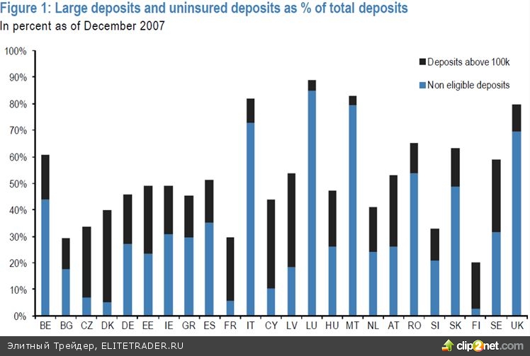 Насколько опасны риски волнения держателей депозитов в других европейских странах, демонстрирует JP Morgan на своей диаграмме, где показаны доли незастрахованных депозитов и вкладов свыше 100 тысяч евро в различных странах ЕС. Как видно, такие депозиты составляют почти половину от всех вкладов. Financial Times