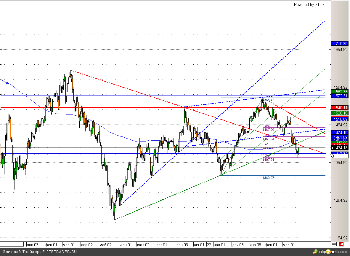 Технически ММВБ подбирается к отметке 1440, где сейчас расположилось серьезное сопротивление в виде сразу нисходящей и восходящей трендовых линий. Пробой 1440 может дать дополнительный импульс роста вплоть до 1460. Между тем если данная затея не увенчается успехом, то самым вероятным событием станет возвращение обратно в район 1400.