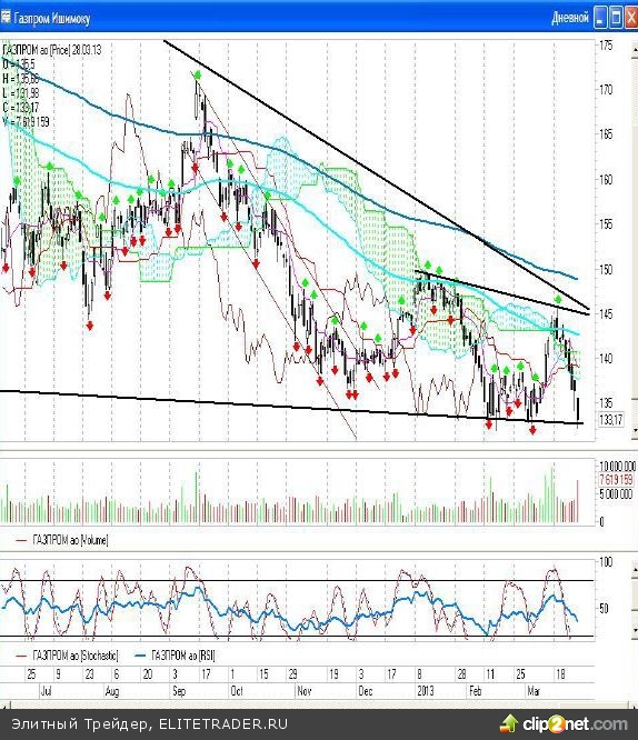 Вышедший вчера отчет «Газпрома» за 2012 год по РСБУ только усугубил положение бумаг. Как сообщается, чистая прибыль «Газпрома» снизилась на 37% до 556,34 млрд. рублей. Прибыль компании от продаж в 2012 г. сократилась на 17% по сравнению с 2011 г. и составила 110,41 млрд. рублей.