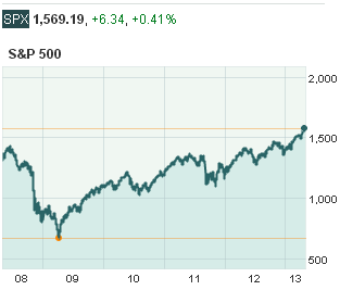 «Для большинства людей, превышение определенного уровня само по себе не заставит переосмыслить свою стратегию», - заявил Эрик Дэвидсон, заместитель главного директора в Wells Fargo Private Bank. – «Однако это рубеж, который заставит вас остановиться и понять, где вы находитесь и откуда пришли». Индекс S&P 500 потерял 6.34 пункта или 0.4% и составил 1,569.19 пунктов. При этом, он все еще выше прошлого максимума, установленного в октябре 2007 года, который составил 1,565.15 и догнал промышленный индекс Dow Jones, который в четверг зафиксировал 10 рекордных закрытий с 5 марта, последнее из которых составило 14,578.54.