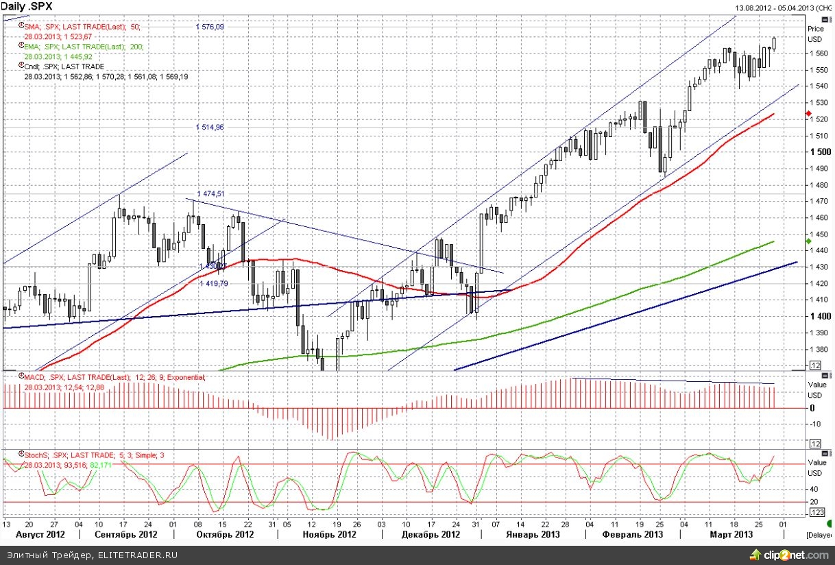 Прошедшую укороченную неделю, и одновременно с тем месяц и квартал американские индексы продолжающие свой многомесячный рост закрыли на исторических максимумах. Индекс широкого рынка S&P превысил 1569 пунктов невзирая на определенные негативные тенденции в европейском валютном союзе, хотя здесь ситуация относительно решения проблем Кипра стала более прозрачна.