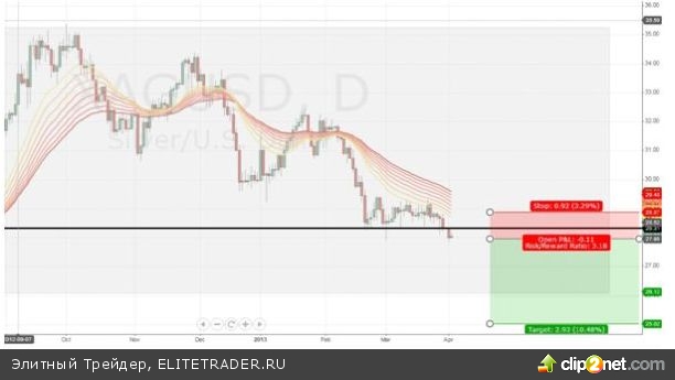 В настоящее время драгоценные металлы большой популярностью не пользуются. Объяснение можно найти в том, что альтернативные финансовые инструменты пока приносят большую доходность, и искать "парковку" в металлах просто нет смысла. Техническая картина по серебру (XAGUSD) указывает на наличие спекулятивной идеи в продажу. Движение цены идет строго по нисходящему тренду, пробитие уровня 28,50 открыло дорогу падения до $25 за тройскую унцию.