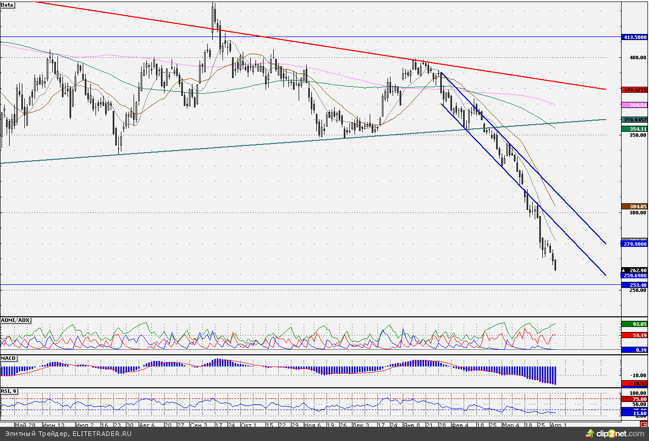 Среди лидеров падения первой половины дня стоит отметить акции «Северстали». Бумаги тянет вниз «медвежья» цель в районе 253,48 руб., где находится незакрытый гэп от 11 января 2010 года. Пока вероятность того, что бумаги продолжат снижение, достаточно велика. Индикатор ADMI/ADX показывает, что преимущество на стороне продавцов (линия «медведей» находится выше линии «быков»), при этом график индикатора MACD(12;26;9) по-прежнему находится на отрицательной территории. Наш 30-минутный торговый робот находится в «шортах», удерживая короткие позиции от отметки 273,9 руб. Таким образом, короткие позиции по бумагам пока более привлекательны.