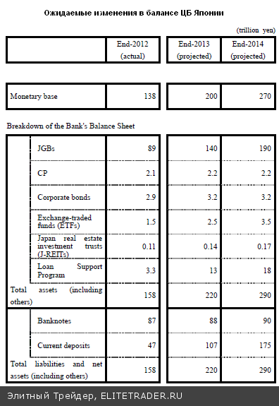 По итогам заседания Банка Японии 3-4 апреля под руководством новоиспеченного главы ЦБ Харухико Куроды большинством голосов (8 против 1) было принято решение сохранить ключевую ставку в диапазоне 0-0,1% годовых и расширить программу по выкупу активов (QE) на 50 трлн. иен - до 151 трлн в год, которая теперь характеризуется не только как количественное, но и как качественное смягчение. Достижение целевого уровня инфляции в 2% ожидается в течение двух лет. Денежная база будет увеличиваться ежегодными темпами на 60 - 70 трлн иен. ЦБ также будет увеличивать вложения в биржевые фонды (ETF) на 1 трлн. иен в год и инвестиционные фонды недвижимости на 30 млрд. иен в год. Так называемое правило «banknote principle» предполагающее ограничение объема покупок гособлигаций общей стоимостью банкнот, находящихся в обращении было также отменено.