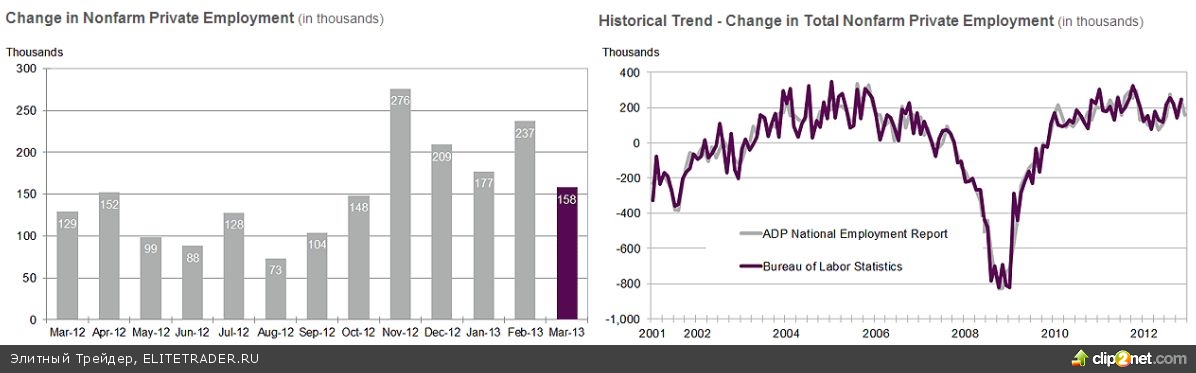 Негативная статистика по американскому рынку труда оказывала давление с одной стороны на рисковые активы с другой на курс доллара. Automatic Data Processing сообщила о росте рабочих мест в частном секторе в марте на 158 тыс., тогда как аналитики ожидали увеличения на 200 тыс. С учетом того, что февральское значение было пересмотрено со 198 до 237 тыс., можно сказать, что замедление темпов роста составило порядка 30%. Данные от ADP традиционно предвосхищают официальную статистику по Non-Farm Payrolls, а значит в пятницу инвесторов может ожидать новая порция негатива.