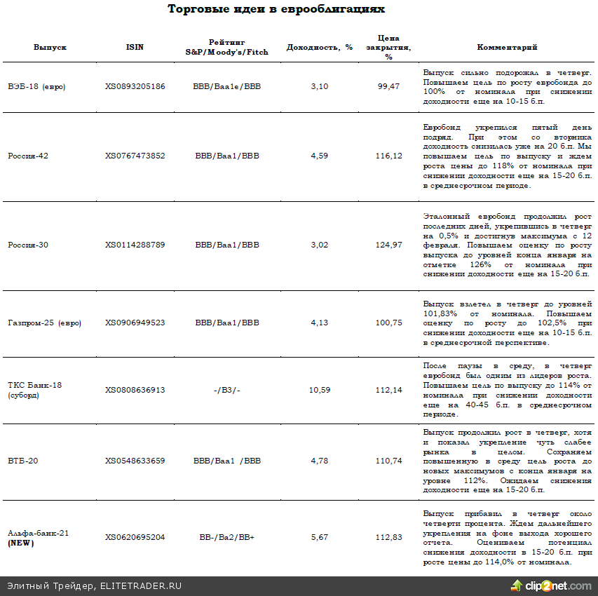 Российские евробонды показали уверенный рост по итогам торгов четверга, продолжив укрепление этой недели и, похоже, «сломав» тенденцию начала года на рост доходности, сформировав задел для ее снижения до январских уровней.