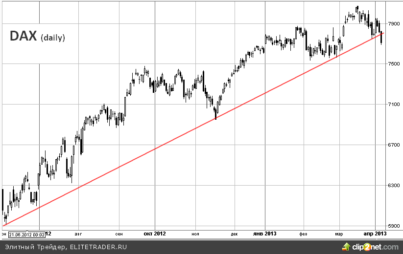 Таким образом, если с выходом американской статистики настроение рынка не изменится, линия восходящего тренда (начало - лето 2012 года) будет пробита, что может окрасить в более темные тона ближайшие перспективы европейского рынка акций.