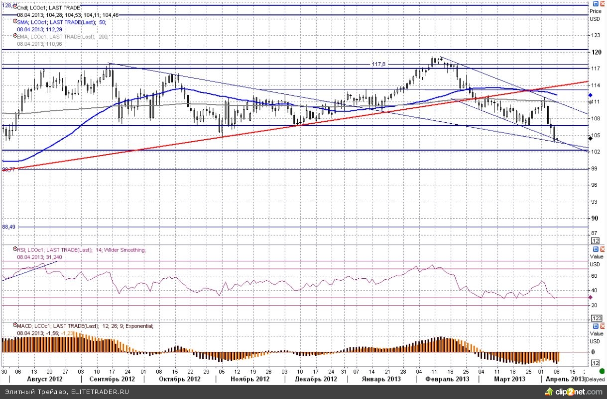 Цена на майские фьючерсы нефти марки Brent понизилась до $104,12 и потеряла 2,10%.