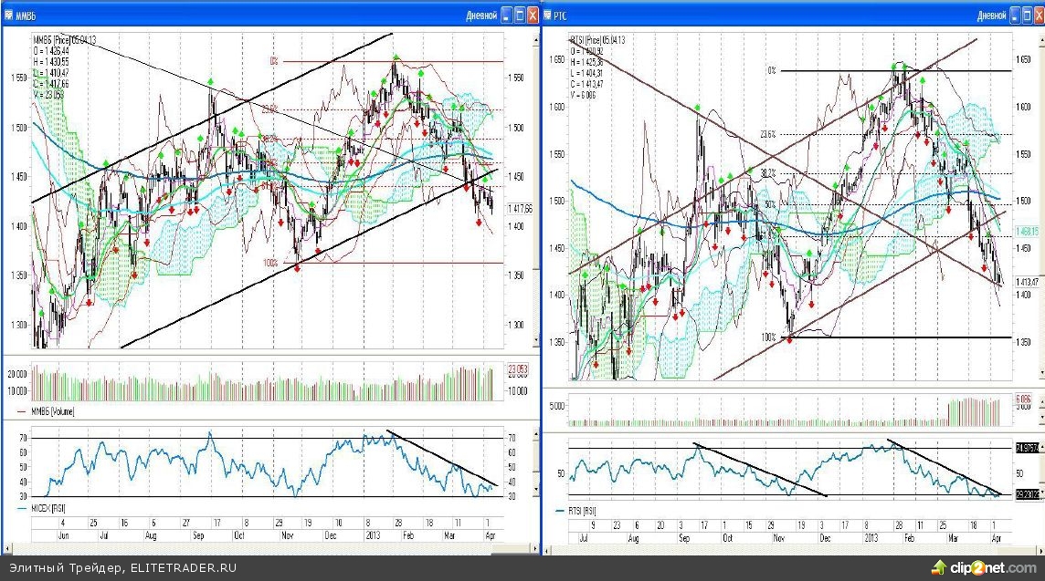 Неделю индекс ММВБ закончил на уровне 1417,66 пунктов, а индекс РТС на рубеже 1413,47 пунктов. Чисто технически говорить о развороте можно будет только в случае ухода индекса ММВБ за максимум прошлого понедельника, который расположен на отметке 1442,7 пунктов. При таком раскладе актуальным станет образование модели разворота «двойное основание» на дневном графике индекса ММВБ.
