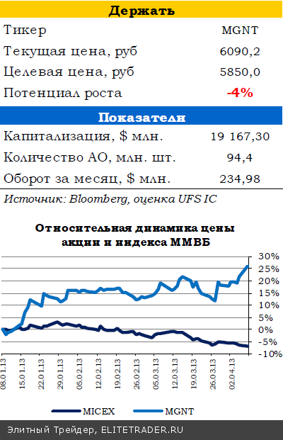 Новость была воспринята рынком чересчур позитивно: вчера акции Магнита, торгующиеся на ММВБ-РТС, выросли на 3,84%. Магнит остается практически единственной компанией в секторе, которая генерирует стабильно-положительный информационный фон. Сеть действительно выглядит сильнее конкурентов, и мы сохраняем позитивный взгляд на компанию. В то же время, спрос на бумаги Магнита, на наш взгляд, в значительной степени замещающий – инвесторы вынуждены выбирать бумагу, так как другие ощутимо хуже. В результате акции Магнита торгуются с внушительными премиями к российским и зарубежным ритейлерам. Оправданность этих премий вызывает все больше вопросов. Мы подтверждаем рекомендацию ДЕРЖАТЬ по бумаге, хотя котировки уже превысили наши целевые уровни. Бумаги обновили максимумы, и это позволяет им и дальше двигаться наверх. Но риски снижения из-за перекупленности возрастают
