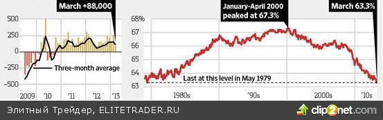 Вместе с тем сокращение уровня безработицы обусловлено снижением общего количества переставших искать работу. В результате коэффициент, представляющий собой отношение численности рабочей силы к общей численности взрослого населения, достиг минимальной отметки с 1979 года.