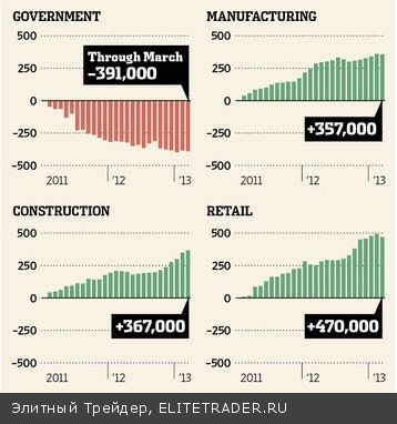 Ситуация не выглядит критичной: в среднем количество людей, имеющих работу вне сельскохозяйственного сектора, за последний год прирастает на 168 тыс., что вполне соответствует ожиданиям ФРС. При такой динамике регулятор способен достигнуть поставленных целей по уровню безработицы через два-три года. К тому же с 2011 года занятость в розничной торговле увеличилась на 470 тыс., в строительстве — на 367 тыс. и в сфере производства — на 357, тыс. человек.