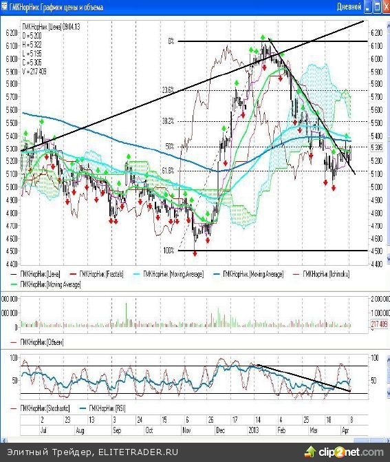 Вчерашний рост акций ГМК «Норильский Никель» на 2,73% до уровня 5306 рублей, говорит о том, что акции готовы к полноценному восстановлению. Напомню, что пару дней назад индикатор Ишимоку был готов образовать «золотой крест», являющийся сигналом к покупкам, и он его все-таки образовал.