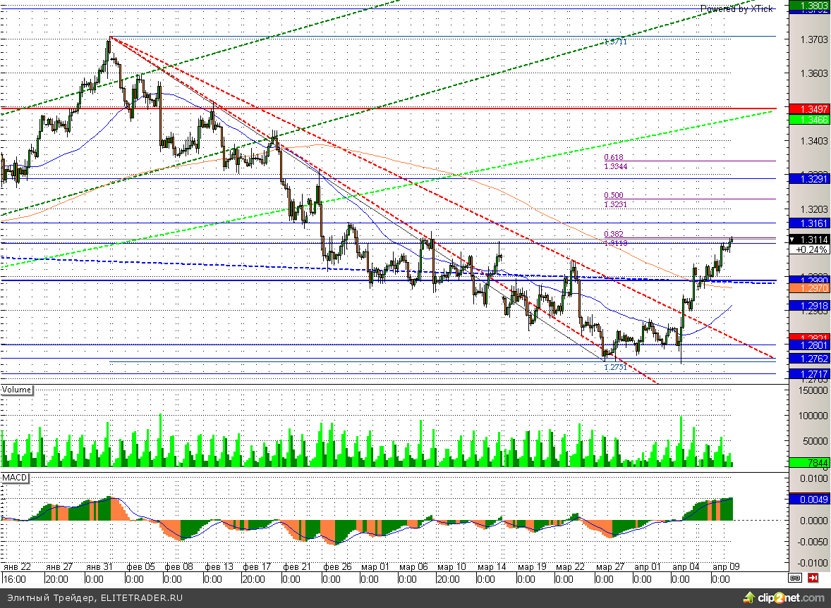 Евро сегодня растет к доллару на 0,2%. Данный рост связан преимущественно с хорошей статистикой по промышленному производству в странах еврозоны, которая выходит на текущей неделе. Таким образом, во Франции за февраль объем промышленного производства вырос на 0,7%, а в Германии поднялся на 0,5%. Между тем данная пара добралась до уровня 1,31, на котором располагается 38,2% коррекции по Фибоначчи, что вполне может приостановить или, по крайней мере, замедлить рост европейской валюты.