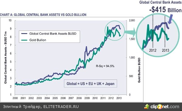 Следует отметить, что балансы регуляторов в последние три месяца сократились на $415 млрд в основном за счет снижения активов ЕЦБ. Напомню, банковские институты региона в этот период производили возврат средств, предоставленных в ходе LTRO. Следовательно, котировки золота должны были упасть на $87,15, а серебра — на $1,6-1,7.