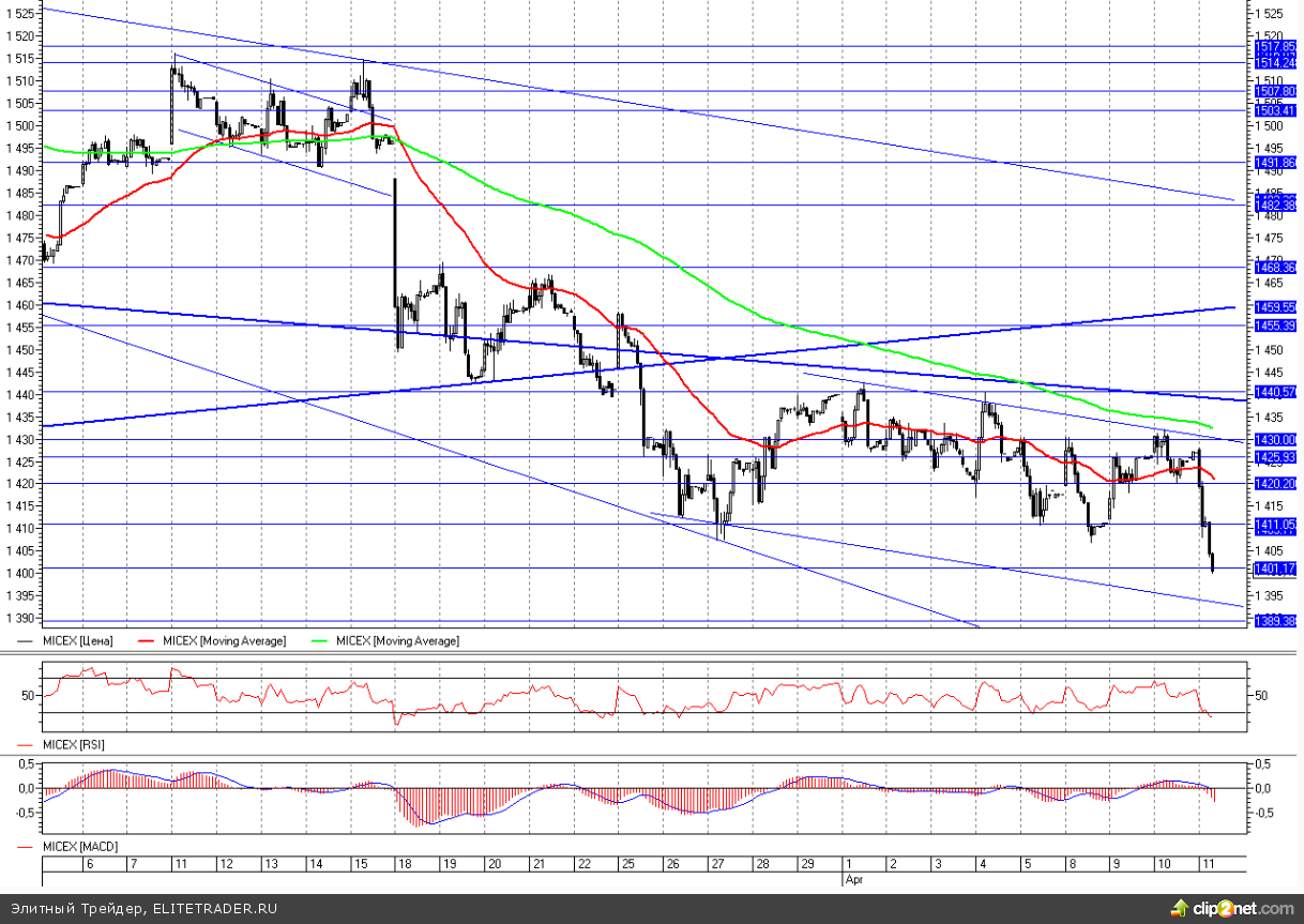Индекс ММВБ находится на уровне 1400,7 (-1,74%)
