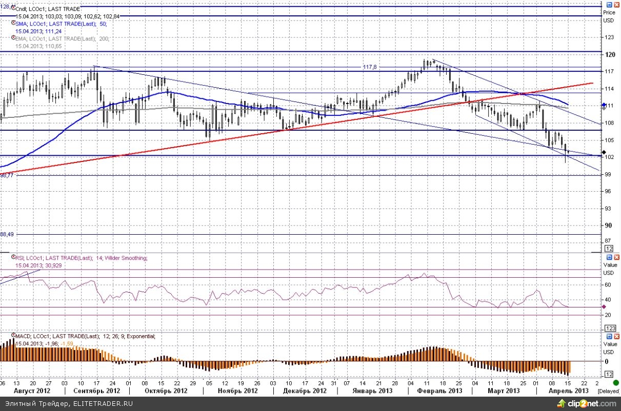 Несмотря на близость ключевых поддержек и локальную перепроданность в прошлую пятницу на рынке черного золота мы вновь наблюдали падение котировок в район минимумов июля прошлого года. Нисходящее движение продолжается в рамках среднесрочного down-тренда. В моменты максимального пессимизма цена предыдущего майского контракта на Brent (подошел к экспирации) даже успела протестировать $101 за баррель.