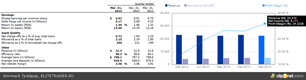 Крупнейший по капитализации банк - Wells Fargo & Company также сообщил о росте чистой прибыли и в то же время снижении выручки и процентных доходов. Чистая прибыль выросла до $4,93 млрд., или 92 центов на акцию с $4,02 млрд. или 75 центов на акцию годом ранее. Аналитики ожидали роста до 87 центов на акцию. Выручка сократилась на 2%до $21,26 млрд. Акции Wells Fargo подешевели на 0,8%.