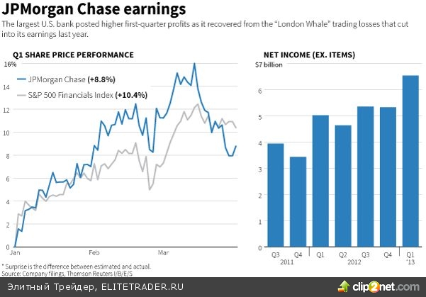 Крупнейший по размеру активов банк - JPMorgan Chase & Co. сообщил о росте чистой прибыли до $6,53 млрд., или $1,59 на акцию, против $4,92 млрд., или $1,19 на акцию, годом ранее. Консенсус прогноз опрошенных Reuters аналитиков предполагал рост до $1,39 на акцию. В то же время выручка сократилась на 3,6% до $ 25,12 млрд. относительно первого квартала 2012 года на фоне снижения процентных доходов банка. Рост депозитов банка заметно опережает темпы кредитования. Капитал первого уровня по tier 1 снизился до 11,6% - с 11,9% в 2012 году. Акции JPMorgan Chase подешевели на 0,61%.