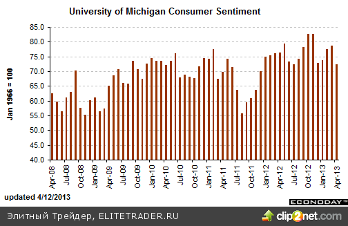 Университет Мичигана предварительно оценил динамику индекса потребительского доверия в апреле сообщив о снижении индикатора с 78,6 до 72,3 пункта, тогда как аналитики ожидали снижения только до 78,5 пункта. Среди причин подобного изменения главным образом здесь можно говорить о последствиях автоматического секвестирования расходов бюджета, что характерно мартовские предварительные данные о подобным снижении к концу месяца были пересмотрены до вышеназванных 78,6 пункта. К тому же мартовские цифры от Conference Board ранее сигнализировали о подобной динамике.
