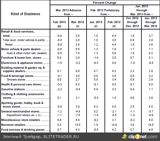 Министерство торговли в пятницу сообщило о снижении в марте розничных продаж на 0,4% до $418,300 млрд., тогда как аналитики не ожидали изменений показателя относительно февральского значения, рост которого в свою очередь был пересмотрен в сторону понижения с 1,1% до 1%. В целом за первый квартал 2013 года показатель вырос на 3,7% относительно аналогичного периода прошлого года. В процентном отношении наиболее существенные потери зафиксированы в категориях «электроники и бытовой техники» (-1,6%) и «АЗС» (-2,2%), относительно последнего отметим, что цены на бензин за этот период согласно данным EIA, по меньшей мере, были стабильны.