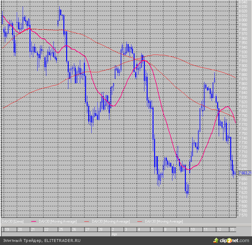 Немецкий индекс DAX резко просел в первой половине дня с 7760 до 7680 пунктов, а затем протестировал отметку 7660. Вполне возможно, что индикатор скорректируется до минимума прошлой недели – 7620 пунктов.