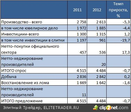 Доля инвестиционного спроса по итогам 2011-2012 годов составляла около 30%. При средней цене в $1668 за унцию, которая сложилась по итогам прошлого года, даже изъятие 50% инвестиций приведет к снижению медианного показателя до отметки $1415 за унцию. В таких условиях даже закрытие третьей части нерентабельных шахт не приведет к балансу на рынке золота.