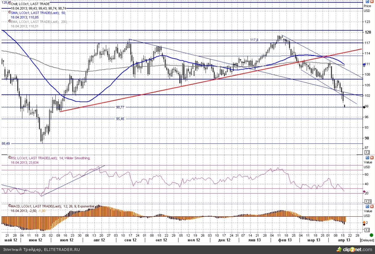 С самого старта недели котировки черного золота продолжили свое нисходяще движение. Цена сорта Brent все также находится в рамках down-тренда и уже сегодня утром мы наблюдаем за проколом ключевого психологического рубежа в $100 за баррель.