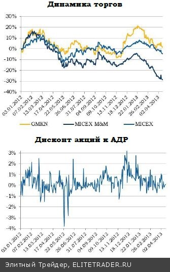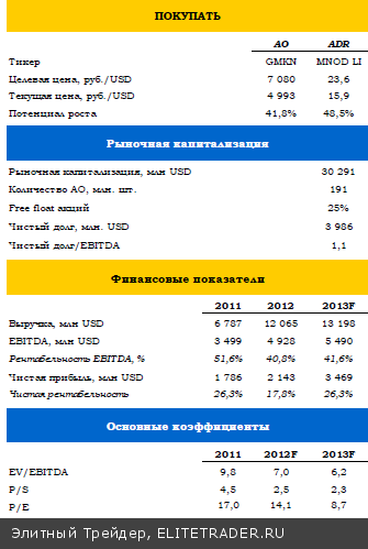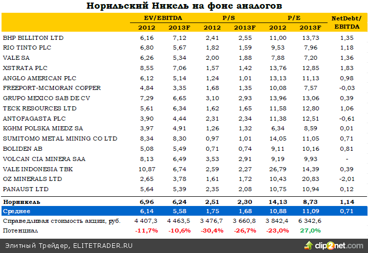 Негативный момент заключается в динамике чистой прибыли, которая сократилась в 2П12 более чем вдвое, чего мы не ожидали. Это связано с изменением учетной политики и нефинансовыми списаниями на $975 млн. Прежде всего они обусловлены падением рыночной стоимости принадлежащих компании 11% акций "Интер РАО" и других ценных бумаг — $525 млн. Кроме того, из-за снижения концентрации металла в руде активов ГМК в Австралии и Ботсване произошло их обесценивание на $151 млн и $110 млн соответственно; в отчете говорится, что в 2013 году ожидается консервация рудников в этих странах. Это должно поддержать рентабельность, которая существенно выше на российских площадках.