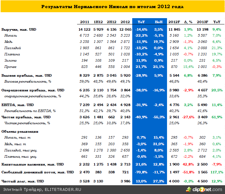Ожидаем, что за счет активного развития зарубежных проектов (в частности, в ЮАР), Норникель сможет нарастить производство никеля в 2013 году, по крайней мере, на 3%. При умеренном восстановлении цен в 2П13 выручка может прибавить порядка 7%.