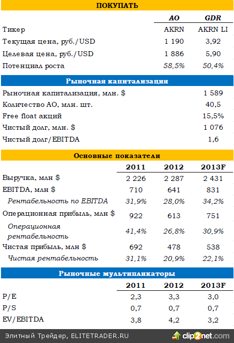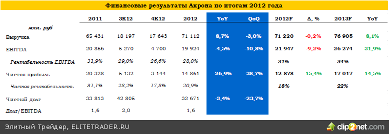 Негативно на финансовых показателях сказалось увеличение себестоимости продукции, вызванное повышением цен на сырье. EBITDA сократилась с $710 млн до $641 млн, рентабельность по EBITDA снизилась с 32% до 28%. Однако в перспективе Акрон планирует запустить производство собственного калийного сырья с 2016 года (Талицкий ГОК); выработка фосфатного сырья на производственных площадках Акрона (ГОК «Олений ручей») началась уже в конце 2012 года.