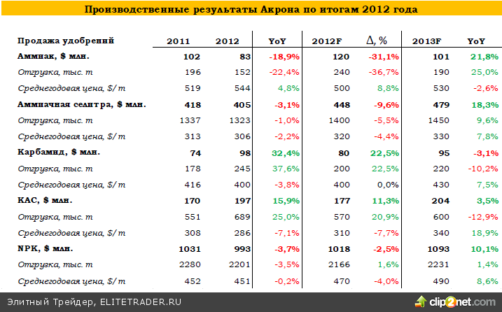 Результаты Акрона за 2012 год выглядят неплохо. Несмотря на небольшое сокращение производства сложных удобрений на российских предприятиях из-за недопоставок апатитового концентрата в июне-июле и длительный капитальный ремонт агрегата аммиака в ОАО «Дорогобуж» в целом предприятия группы отработали с высокой загрузкой мощностей. Годовой объем производства остался примерно на уровне 2011 года и составил 5,848 млн тонн. В четвертом квартале выпуск вырос на 7,4% до 1,415 млн тонн.