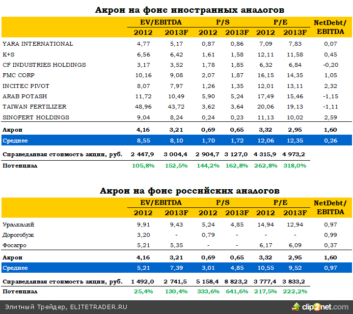 Сравнительный анализ по-прежнему показывает, что Акрон недооценен относительно других производителей удобрений. На наш взгляд, по мере повышения ликвидности бумаг, компания будет более высоко оцениваться рынком.