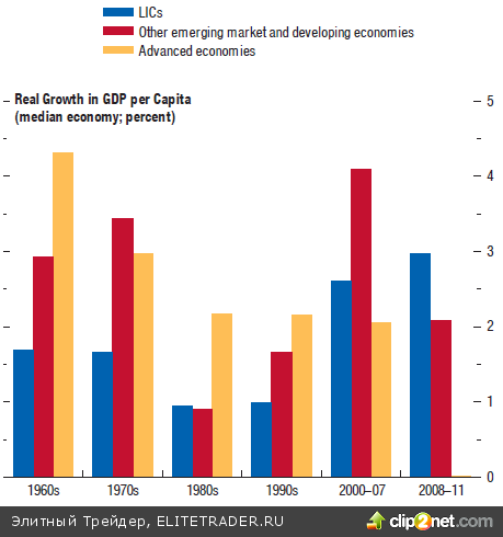 Кроме того, МВФ отмечает, что малодоходные экономики в целом демонстрируют в последнее десятилетие гораздо лучшую динамику, чем в 60-е и 70-е гг. Наглядно это видно на следующей диаграмме, где синим цветом отмечены Low-Income страны, красным - emerging markets и развитые страны, а желтым – высокодоходные экономики.