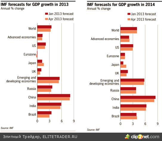 Диаграммы сравнения январского и апрельского прогнозов МВФ за 2013 и 2014 гг. по разным странам