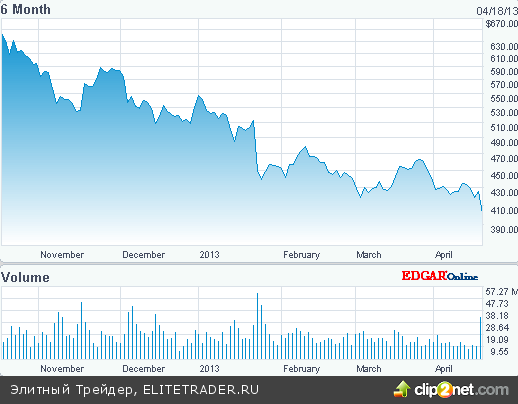 Акции Apple провалились ниже $400 – это минимальный уровень с декабря 2011 года. Причиной стали опасения инвесторов относительно того, что руководство компании не спешит с созданием новых продуктов, и позиции Apple ослабевают под напором таких гигантов, как Samsung, Google и Amazon.com. Cirrus Logic, поставщик чипов для iPhone и iPad, заявил, что продажи смартфонов от Apple буду ниже ожиданий аналитиков.