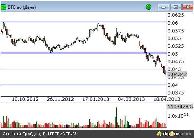 Снижение идет полным ходом. Котировки отрабатывают вниз на ширину предыдущего диапазона. Целью такого движения по-прежнему выступает отметка 0.040 рублей, где покупателям будет оказываться значимая поддержка.