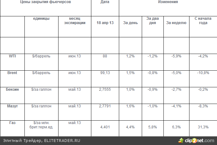 Контанго – превышение цены фьючерсов по нефти марки WTI с погашением в сентябре над ценой июньского фьючерса уменьшается, но остается положительным и на сегодня составляет +0,1%. Сохраняющаяся положительная величина контанго (остается такой уже длительное время) свидетельствует о перевесе ожиданий подрастания цен нефти в США. По нефти марки Brent цены фьючерсов ситуация обратная – там беквордация и цены дальних фьючерсов на -0,8% ниже цен ближайших фьючерсов. Ожидание сближения цен по обе стороны Атлантики сохраняется уже длительное время и последние недели реализуется в активном сближении цен указанных продуктов. Разница цен ближайших фьючерсов бочки нефти марки Brent и североамериканской легкой нефти марки WTI на закрытие 18 апреля 2013 года составляет $11,1 за баррель.