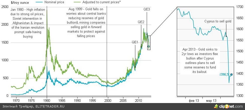 Еще одним драйвером снижения наряду с тем, что великая паника 2008-2011 годов наконец закончилась, является ликвидация призрака инфляции. Ожидания роста цен, обусловленные реализацией масштабных программ количественного смягчения, так и остались ожиданиями. На самом деле, если привести индекс потребительских цен (CPI) в США к текущим ценам и сопоставить его динамику с динамикой котировок фьючерсов на золото, вырисовывается довольно любопытная картина.