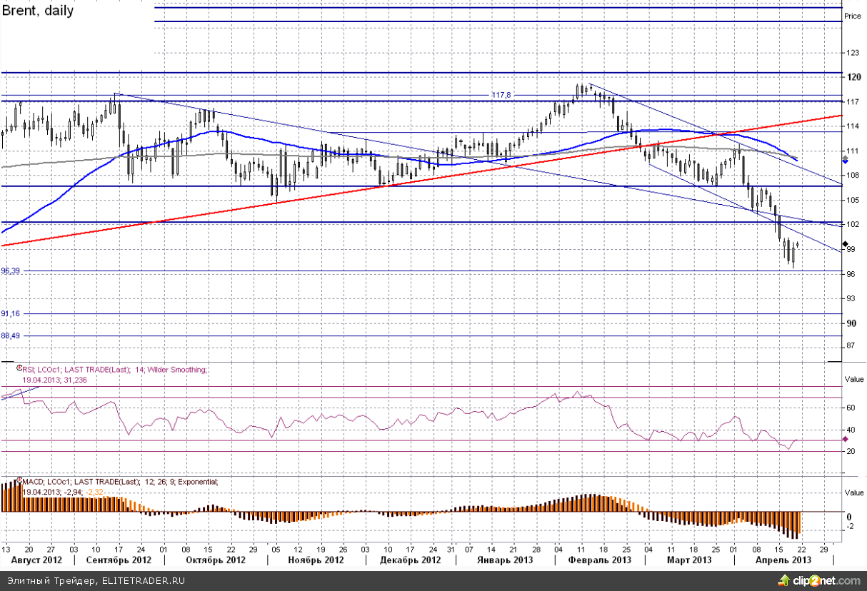 Но в то же время сразу же отметим, что пока никаких технических сигналов о сломе падающего тренда мы не получали, соответственно после небольшой волны роста мы снова ожидаем увидеть попытки сходить на очередные минимумы. В частности отметим, что в случае закрепления цены под отметкой $96 следующая остановка ожидается лишь в районе $91 за баррель.
