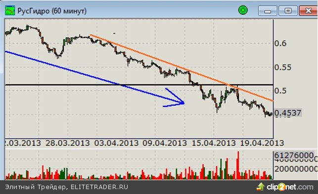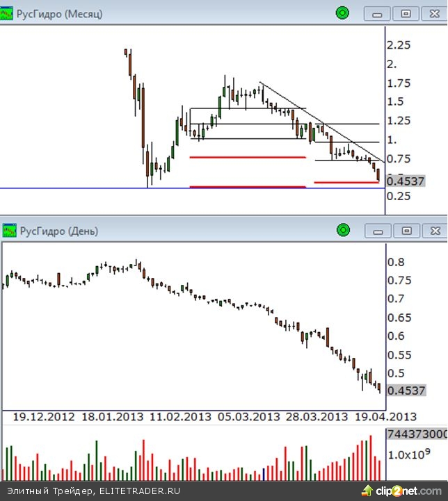 Тренд вниз длится уже 2.5 года. В последнее время нисходящая тенденция получила ускорение. Остановки в текущем движении пока не наблюдается. Однако, стоит обратить внимание на некоторые моменты. На месячном графике котировки приближаются к минимумам 2008 года, которые выступают технической поддержкой. Коме того, здесь же сходятся два расширения Фибоначчи, построенные от двух волн падения, уровни которых цены технично отрабатывали раньше. На дневном графике объем торгов на снижении в последние несколько дней нарастал по мере новых ценовых минимумов. После выхода пикового объема, активность торгов резко спала, хотя цены продолжили снижаться. На часовом графике также остановки в снижении нет. Таким образом, потенциал движения вниз сохраняется. Но, учитывая приведенные факторы, мы полагаем что он ограничен описанными уровнями. Для покупателей первым сигналом может стать слом локального даун тренда на часовом графике. Если в дальнейшем цены преодолеют и горизонтальный уровень предложения, то шансы на постепенное восстановление будут гораздо выше.