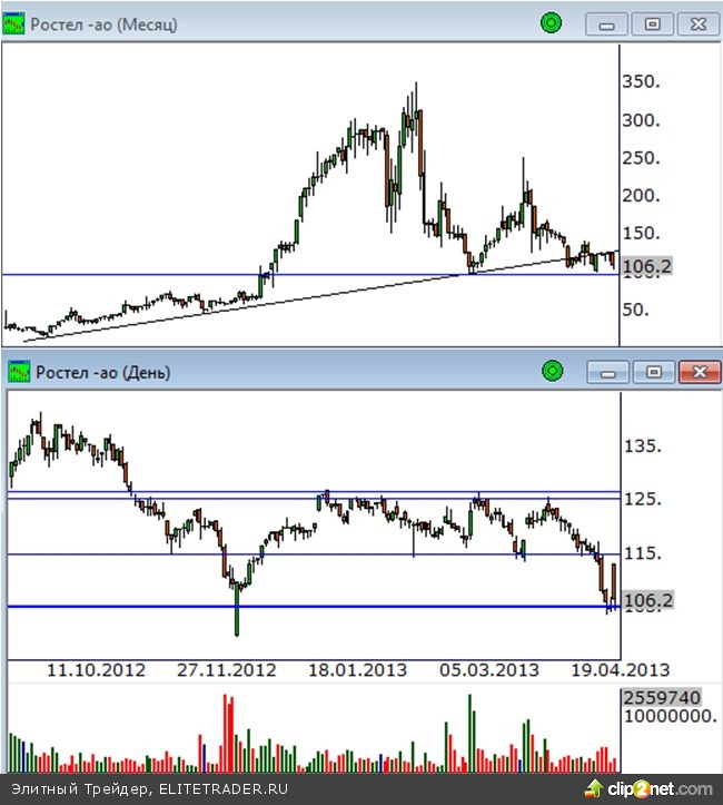 Нижняя граница широкого боковика удерживает котировки от снижения. Отбой с текущих позиций даст покупателям шанс на возврат цен в район осевой линии боковика - отметке 115 рублей. В противном случае снижение продолжится и опустит цены на ширину текущего диапазона, т.е.в район отметки 95 рублей. Здесь же проходит горизонтальный уровень спроса, показанный на месячном графике. Этот уровень весьма важен для покупателей, потому как восходящий тренд оказался сломленным, а сила отскоков продолжает затухать.