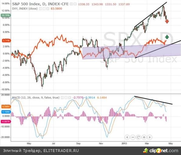 Технический анализ дает возможность предположить, что американский индекс S&P500 может начать снижаться. Взгляд основывается на наличии дивергенции по S&P500 и начале формирования восходящего тренда по индексу доллара DXY. Движение этих двух активов происходит с отрицательной корреляцией.