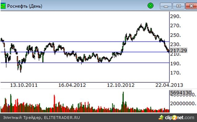 Пробой отметки 235 рублей негативно сказался на котировках. Последовавшая волна снижения цен опустила их в район отметки 213 рублей, вблизи которой проходит очередной важный для покупателей уровень спроса. Как видно, в последние дни они пытаются изменить ситуацию в свою пользу, удерживая цены на данной поддержке, оформив локальный отскок. Таким образом, текущий диапазон движения цен сейчас находится в границах 235-213 рублей. Пробой отметки 213 будет означать переход котировок на новые уровни в диапазоне 213-191 с потенциалом движения к его нижней границе.