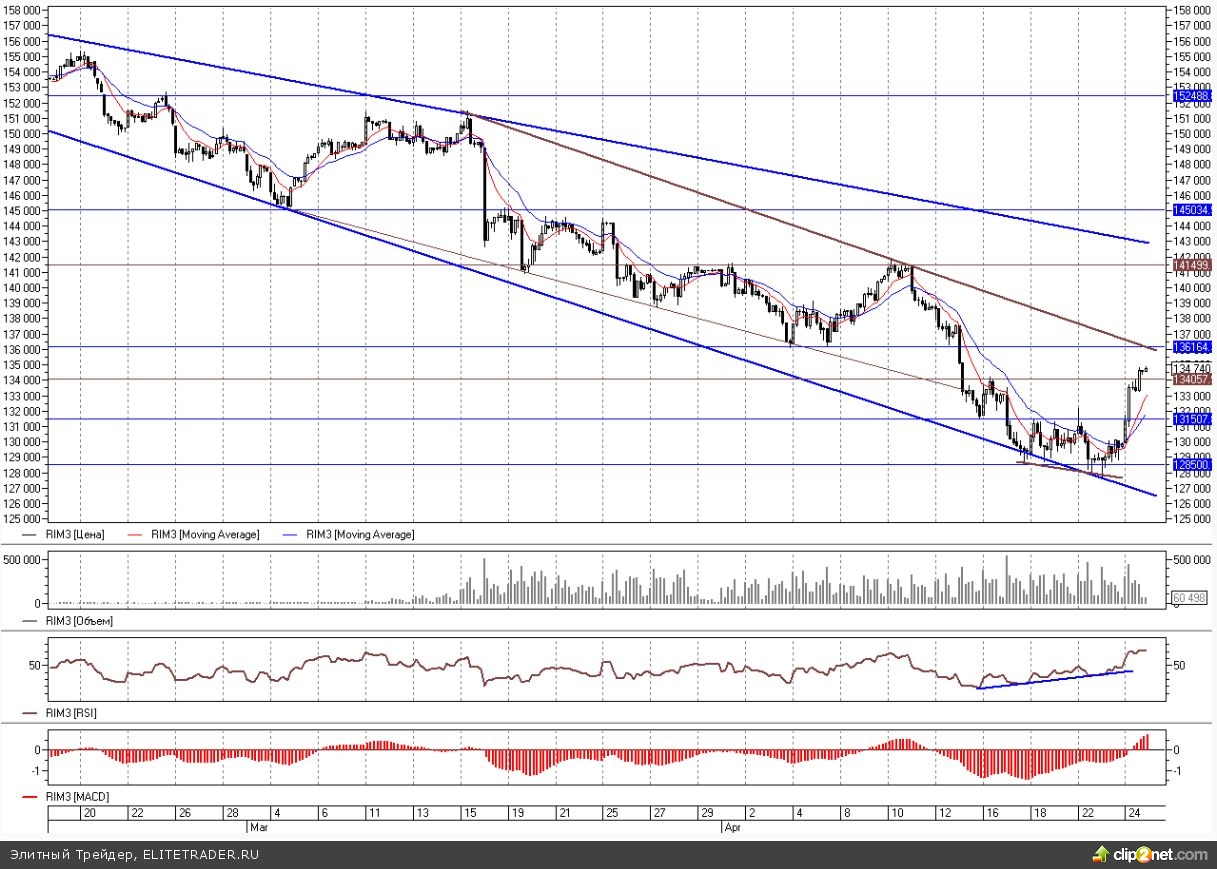 После консолидации нескольких дней на текущих минимумах в диапазоне 128500-131500 фьючерс на индекс РТС накануне организовал уверенную волну роста, отыгрывая понесенные в апреле потери. На активном закрытии коротких позиций и начале игры на повышение RIM3 поднялся к уровням на 134000-135000.
