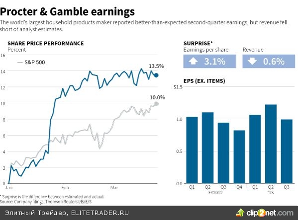 Procter & Gamble превысила прогнозные оценки по прибыли за первый квартал, не дотянув до консенсуса по выручке. В большей степени негативно был воспринят прогноз компании на второй квартал, согласно которому прибыль сократится до $0,6-$0,77. Чистая прибыль Procter & Gamble выросла до $2,57 млрд. или 88 центов на акцию против $2,41 млрд. или 82 центов на акцию годом ранее. Прибыль от основных операций составила 99 центов превысив прогнозные 96 центов. Продажи выросли на 2 процента до $2,06 трлн. в то время как аналитики ожидали $2,073 трлн.