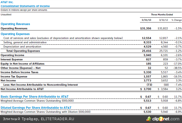Выручка AT&T снизилась в первом квартале до $31,36 млрд. с $31,82 млрд. в аналогичном периоде прошло года, аналитики, в среднем, ожидали доходов на уровне $31,74 млрд. Скорректированная чистая прибыль на акцию выросла с 59 центов до 64 центов на акцию, что соответствует консенсус прогнозу. В особенности инвесторов расстроило снижение числа абонентов сотой связи компании на 69 тыс., вывод о чем был сделан из представленных цифр по общему увеличению абонентской базы на 296 тыс. при чистом приросте в 365 тыс. абонентов, использующих планшетные компьютеры.