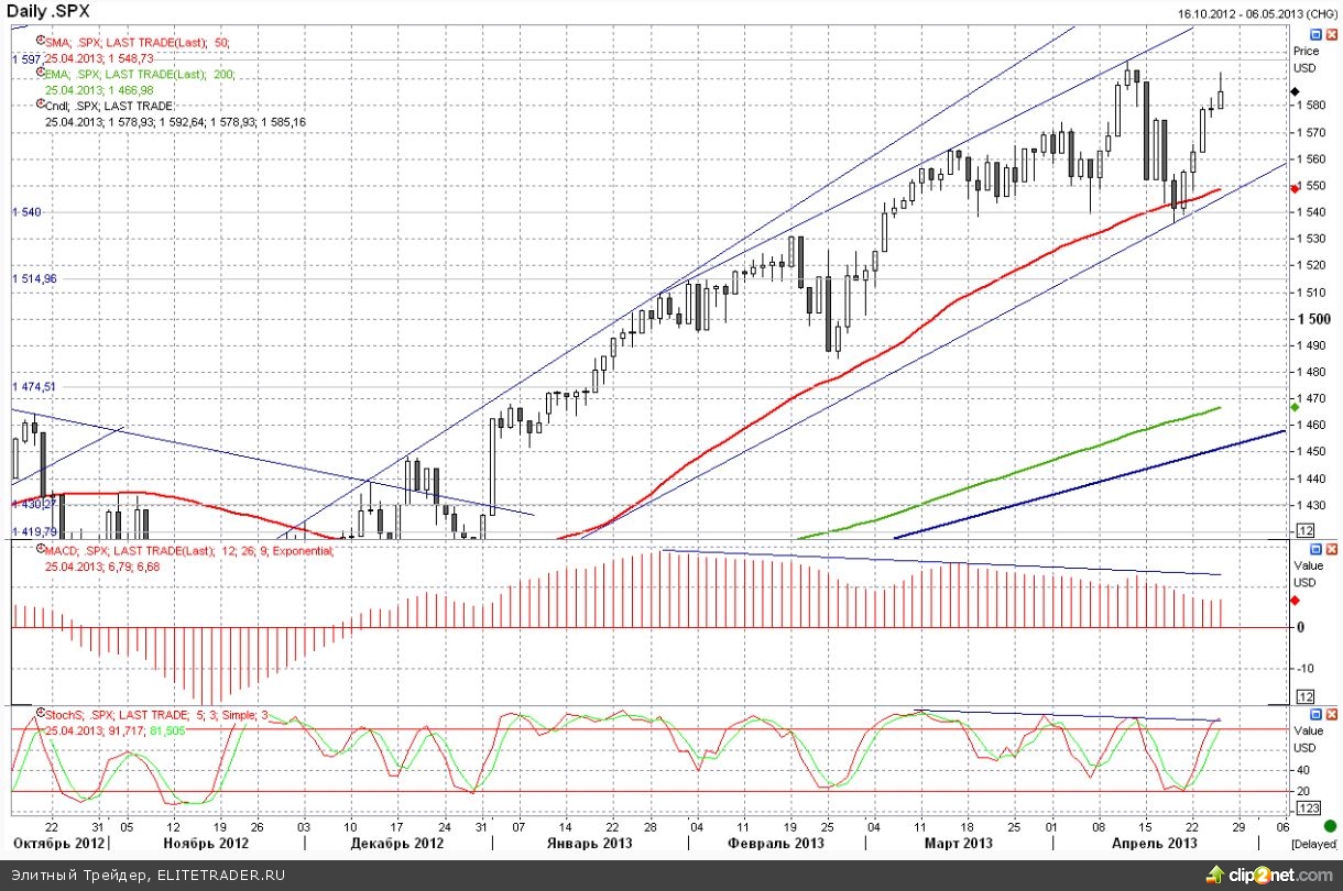 На следующей неделе ключевыми событиями будут заседания Центробанков США и Еврозоны. Если от ЕЦБ аналитики ожидают снижения ставки с 0,75% до 0,5%, то относительно действий ФРС присутствуют опасения сокращения программы выкупа активов, и они могут усилиться в зависимости от темпов роста вышеупомянутого ВВП. Тем не менее, с учетом мартовских слабых данных по рынку труда, и снижении инфляции, в соответствии с двойным мандатом Федрезерва пока беспокоиться особо не о чем. В целом в преддверии последнего весеннего месяца самое время, вспомнить, пожалуй, самую известную биржевую поговорку «Sell in May and go away», ведь уже не за горами очередной раунд споров по потолку госдолга.